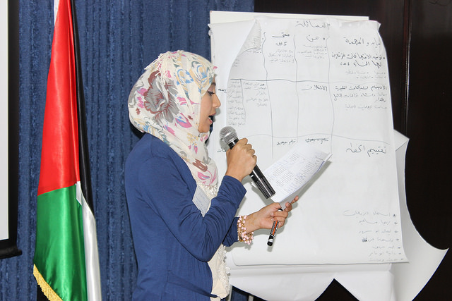 Palestine ( May 2014) – Karama partners in Palestine, including TAM (Women Media Development), MIFTAH, and the Palestinian Working Women’s Society for Development (PWWSD), held four workshops from April to May 2014 to address national implementation of UN SCR 1325 and priority issues for women, peace, and security. The action plan, implemented in partnership with Karama, followed up on the launch of the Arab Regional Network on Women, Peace, and Security and on priorities identified at an April 2014 regional seminar on gender in conflict held in Amman, Jordan.